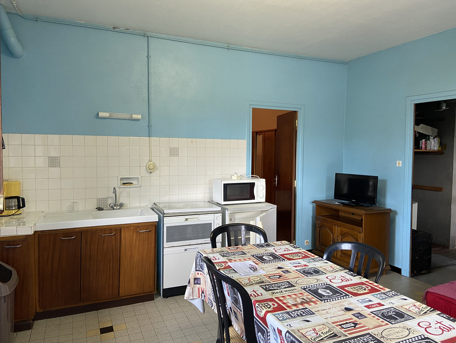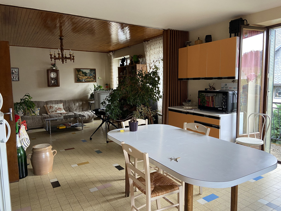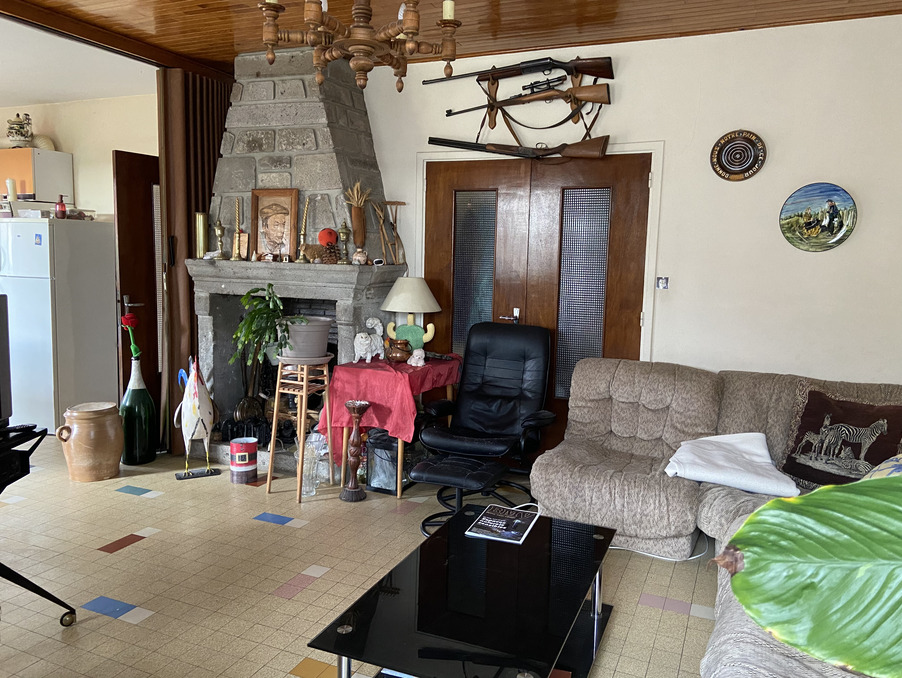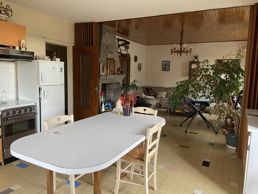 Une vaste pièce de vie avec cuisine équipée, une cheminee et un balcon donnant côté jardin.