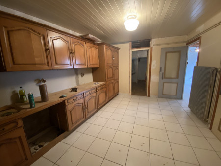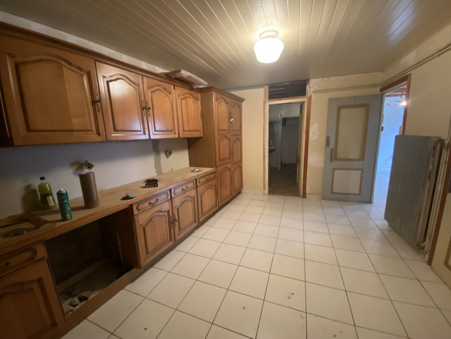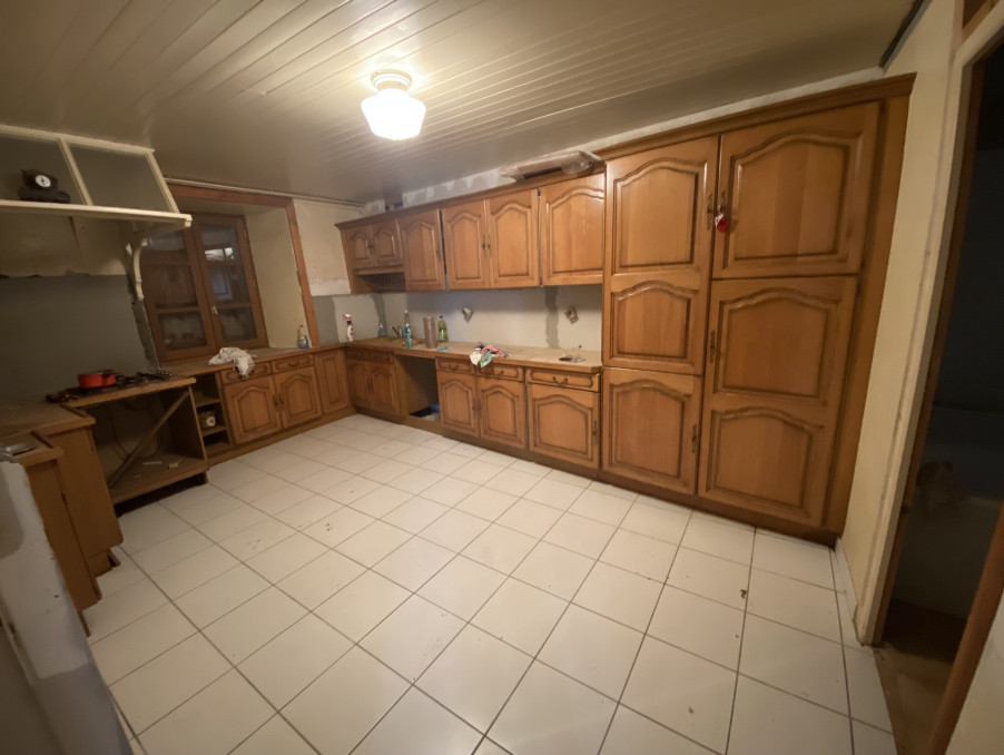 Cette grande bâtisse à rénover se compose au rez de chaussée : entrée, salon avec cheminée, salle à manger, grande cuisine équipée. Salle d'eau et wc.